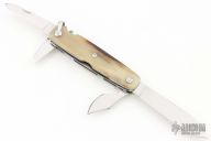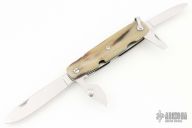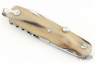 This knife features 5 mirror polished blades and a cork screw. The handle has honey horn steel scales over steel liners. Excellent Condiiton.