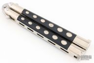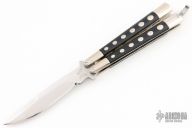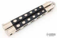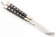 This Balisong by Benchmade features a polished Weehawk blade with false top edge. The handles are chrome plated zinc with black plastic inlays. Has some light scratches, otherwise excellent condition. Comes with original sheath and a Benchmade box from the right era, but it is for a Model 35s