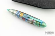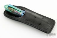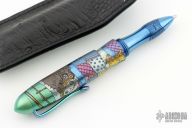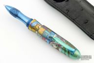 This Zeppelin Pen from Dmitry Streltsov features an anodized "Bad Teddy Clown" titanium body and pocket clip. Tip unscrews and turns around to screw in and reveal the pen tip. Comes with original box and sheath. Excellent condition.