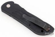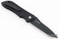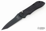 The Model 9100 Auto Stryker is the automatic version of Benchmade's Designer Series Stryker. Designed by Allen Elishewitz, the AutoStryker features a 3.5" 154CM drop point Tanto blade. The handle is made from 6061 T6 aircraft aluminum, hard anodized black for durability. This knife is designed for people who like the features of the Tanto blade shape, but do not want a chisel ground blade; the knife has a double bevel and is symmetrically ground. This one has a black coated blade. Black tip up carry clip. Comes with original box and papers. Excellent condition.