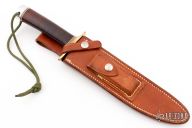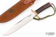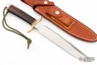 "The Model 1 by Randall Made Knives was made famous by Allied combat troops in World War II and has since been widely used in all theaters of war." This knife features a satin finished blade with a sharpened top edge, .217" blade stock and 1.189" blade depth, hidden tang construction. Brass guard, stacked leather handle with red/white/blue spacers, and a duralumin butt cap. Includes a brown leather sheath and a Randall zippered case. Has a few light scratches, otherwise excellent condition.