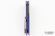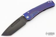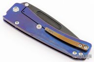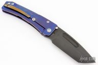 This Slim Midi Marauder from Medford Knife and Tool features a black PVD drop point tanto blade with thumb stud and fullers. The handle is comprised of a tumbled and anodized titanium frame with tip up clip. Excellent detent, lockup, and seating. Original hard case and COA dated Jan 26, 2022. Has a couple light scratches, otherwise excellent condition