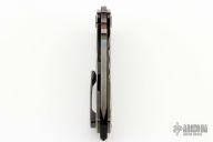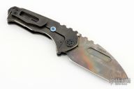 This Praetorian Genesis T by Medford Knife and Tool features a Vulcan finished tanto blade with fullers and notched thumbrest. The handle has a PVD titanium frame with a titanium tip up pocket clip and a D2 backspacer/glass breaker with lanyard bail.  Includes original box, hard case and COA dated May 18, 2021. Has a couple light scuffs, otherwise excellent condition.