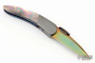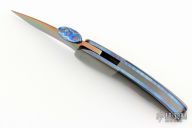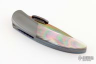 This Linerlock by Glenn Are Hovin features a Damascus blade with a press thumb-fitted DarkTi thumbdisc. The handle has zirconium bolsters, Austrailian black pearl scales, titanium liners with jeweled interiors and exteriors, zirconium backspacer. Every screw on the knife is hidden, pretty impressive and clean. Nice detent, lockup and blade seating. Comes with zippered case. Has some light scratches on the handle. Excellent Condition otherwise.