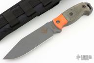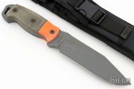 The handle is orange G10 and black micarta. Designed by Justin Gingrich (RANGER KNIVES) and has his signature on the blade. Limited Edition only 118 ever made. USA made.