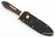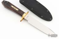 This is a discontinued Bill Bagwell designed Drifter Bowie, made by Ontario Knife. Has a satin spear point blade, .300" blade stock and 1.220" blade depth, hidden tang construction. Wooden coffin handle with nameplate and brass pins. Black leather sheath with brass rivets and stud. Has some patina, otherwise excellent condition. Comes with original box.