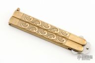 This balisong by Frost Cutlery features a satin finished blade. The handles are brass channel construction with brass scales. Has a brass T-latch. Has some scratches, but otherwise good condition for its age! Comes with original box.