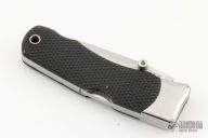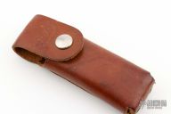 This SOG Winder I lock back by SOG features a satin finish blade with false top edge and dual thumbstuds. The handle has satin finished stainless steel bolsters, liners and backspacer, checkered rubber scales. Strong lock up. Has some light scratches, otherwise good condition. Comes with a brown leather SOG sheath.