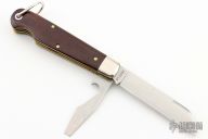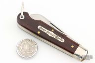This Beer Scout from Great Eastern Cutlery features a satin finished 1095 carbon steel blade and secondary bottle opener. The covers are maroon linen micarta. Knife is in excellent condition and shows no signs of use or carry. Comes in original "butchers" paper and tube with "Beer Scout Knife Club" button.