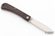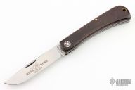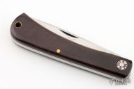 This Farm and Field Tool Bullnose by Great Eastern Cutlery features a satin finished drop point blade with swedge and nail nick. The handle has maroon linen micarta scales with brass pin and lanyard tube over stainless steel liners and backspring.  Includes original cardboard tube packaging and wax paper wrapping.  Excellent condition.