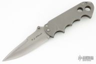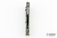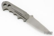This Folding Fighter by R.J. McDonald features a bead blasted chisel ground blade with sharpened top edge, a checkered thumbstud and notched thumb ramp. The handle has a bead blasted titanium frame. Lanyard hole in pommel. Nice detent and lockup. Has some scuffs on the handle, otherwise excellent condition.