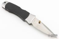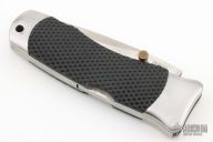 This SOG Winder II lock back by SOG features a satin finish blade with false top edge and dual thumbstuds. The handle has satin finished stainless steel bolsters, liners and backspacer, checkered rubber scales. Strong lock up. Has some scratches and patina, otherwise good condition. Comes with a nylon velcro sheath.