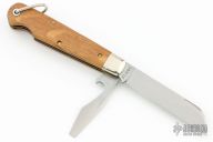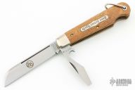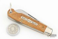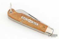 This Beer Scout from Great Eastern Cutlery features a satin finished 1095 carbon steel blade and secondary bottle opener. The covers are wood. Knife is in excellent condition and shows no signs of use or carry. Comes in original "butchers" paper and tube with "Beer Scout Knife Club" button.