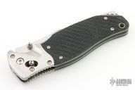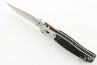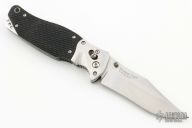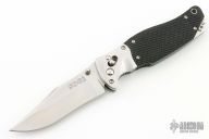 This SOG TomCat Axis Lock Folder has a VG-10 blade with dual thumb studs and a notched thumbrest. Handle is black rubber with satin finished stainless steel bolsters over stainless steel frame with notched thumb rest and black fiber back spacer. Has lanyard hole. Comes with SOG nylon velco sheath. Has some scratches and patina, otherwise good condition.
