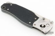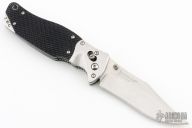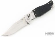 This SOG TomCat Axis Lock Folder has a VG-10 blade with dual thumb studs and a notched thumbrest. Handle is black rubber with satin finished stainless steel bolsters over stainless steel frame with notched thumb rest and black fiber back spacer. Has lanyard hole. Comes with SOG nylon velco sheath. Has some light scratches, otherwise excellent condition.