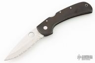 This Wayne Goddard knife by Spyderco features a satin finished blade with thumbhole and serrations. Signed by Wayne Goddard on the blade. The handle is black linen micarta. Has scratches, has been used. Great condition otherwise.