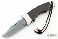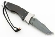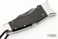 This Vintage Platoon Leader lock back by SOG features a blued blade with false top edge and nail nick. The handle has satin finished stainless steel bolsters, liners and backspacer, black linen micarta scales. Has some scratches, otherwise good condition. Comes with a black nylon sheath.
