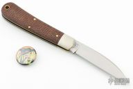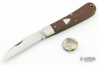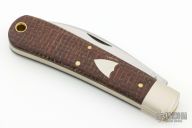 This knife by Great Eastern Cutlery features a satin finished blade with nail nick. The handle has pinched steel bolsters and brass liners, burlap covers. Comes with original packaging. Excellent condition.