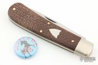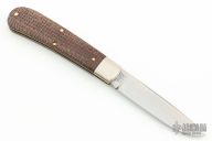 This knife by Great Eastern Cutlery features a satin finished blade with nail nick. The handle has pinched steel bolsters and brass liners, burlap covers. Comes with original packaging. Excellent condition.