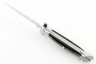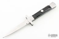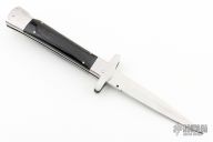 This Auto by Agasi Hambartsumian of Armenian Doctor Knives features a mirror polished blade. The handle has stainless steel bolsters and liners, buffalo horn scales with brass pins, fileworked stainless steel backspacer. New from maker. Comes with a hand tooled brown leather sheath.