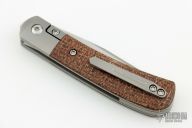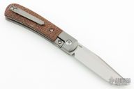 This Trapper Front Flipper by Enrique Pena features a satin finished blade with a front flipper and notched thumbrest. The handle has titanium bolsters, burlap micarta scales with a titanium backspacer and matching tip up pocket clip. Includes a Pena X-Series padded box. Excellent condition.