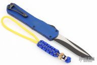 X-Men Series Manticore-X with a special deep engraved Blue Aluminum chassis with a hand painted Yellow X-men logo. Two-Tone DLC Recurve Edge Blade, and DLC Hardware and DLC Ti clip. Hand tied paracord lanyard featuring a custom hand crafted bead from Harding Inc. Bead is Silver/Brass Finished, and each bead is slightly different in its markings.