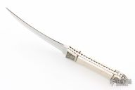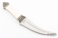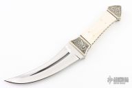 This Small Persian Dagger by Norman Bardsley features a mirror polished double edged blade with .170" blade stock and 1.195" blade depth, full tang construction. The handle has engraved nickel silver bolsters, mammoth ivory scales with black and white spacers, fully fileworked tang. Has a couple light scratches, otherwise excellent condition.
