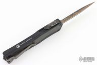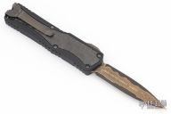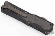 This Colossus by Heretic Knives features a hand ground Baker Forge Damascus double edged blade. The handle has a black aluminum frame with Black Dunes Fat Carbon inlays, DLC stainless steel thumb slide with Black Dunes Fat Carbon inlay, stainless steel tip down clip. Comes with original box, zippered case and COA dated 5/22 and s/n 013. Excellent condition.
