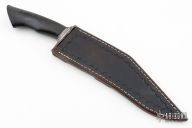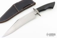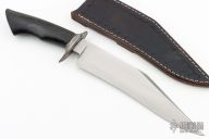 This Rebel Fighter Bowie by Journeyman Smith Stephan Fowler features a clip point flat ground hand rub satin finished blade with a false top edge, a nice hamon line and hidden tang construction. Blade is .231" thick and 1.702" deep. The guard is wrought iron with a bog oak grip. Comes with hand tooled black leather sheath. Fits extremely nicely in hand. Has a few light scratches, otherwise excellent condition.