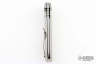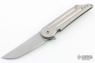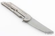 The Kwaiback by Hoback Knives features a bead blasted and stonewashed blade with notched thumbrest and flipper. The handle has a satin finished titanium frame and tip up clip. Rides on bearings, nice detent, lockup and blade seating. Comes with original box.  Excellent Condition.