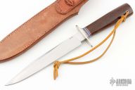 This Fighter by Mike Silvey features a satin finished blade with sharpened top edge, .215" blade stock and 1.130" blade depth, hidden tang construction. The handle has a nickel silver guard, brown linen micarta grip, red/nickel silver/blue/white spacers. Comes with a hand tooled brown leather sheath. Has some light scratches, otherwise excellent condition. #1013