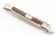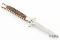 This 13" Batwing Swinguard Auto from A.G.A. Campolin has a mirror polished stainless steel spear point blade with false top edge. Handle has stag scales with polished nickel silver bolsters and pommel, brass liners, brass pins, stainless steel backspacer. Has a few scratches, otherwise excellent condition.