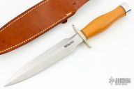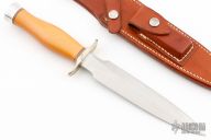 The Model 2-7 by Randall Made Knives has a nickel silver double guard, yellow Westinghouse paper micarta grip, duralumin butt, red/white/blue spacers. Satin finished double edged blade, .205" blade stock and 1.262" blade depth, hidden tang construction. Comes with a brown leather sheath. Has some light scratches, otherwise excellent condition.