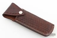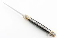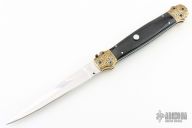 This Auto by Agasi Hambartsumian of Armenian Doctor Knives features a mirror polished blade. The handle has engraved brass bolsters, stainless steel liners, buffalo horn scales with stainless steel pins, fileworked stainless steel backspacer. New from maker. Comes with a hand tooled brown leather sheath.