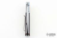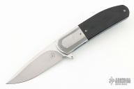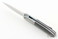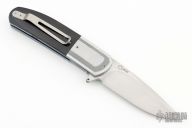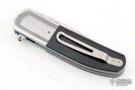 This K1 by Keith Kruger features a hand rub satin finished blade with notched thumb-rest and flipper. IKBS System (Ikoma Korth Bearing System). The handle has mirror polished, stippled and bead blasted stainless steel bolsters, black G-10 scales with red backing, anodized titanium liners, black G-10 backspacer, tip up titanium clip. Nice detent, lockup, and blade seating. Comes with nylon Velcro case and certificate of authenticity. One of the clip screws is a little stripped, otherwise excellent condition. #4 on tang of blade.