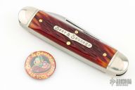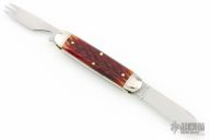This Beer & Sausage knife from Great Eastern Cutlery features a satin finished 1095 carbon steel blade and a secondary bottle opener/fork.  Includes a beard comb. The handle has fluted nickel silver bolsters, dyed jigged bone covers, brass liners and stainless backsprings.  Includes the original packaging.  Excellent Condition.
