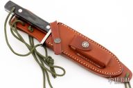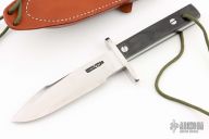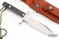 This Model 17 Astro by Randall features a satin finished spear point blade with false top edge, .221" blade stock, 1.408" blade depth, full tang construction. Black linen micarta scales, fastened with removable stainless steel bolts. A slot in the heavy tang and matching hollow inside the handle may be used to carry matches, fishhooks, line and other survival items. The Model 17 was especially designed for the seven Mercury astronauts who carried them on America's first manned space flights. Astronaut Gordon Cooper did the final design, and two of these historically valuable knives are on display in the Smithsonian Institution. Includes brown leather sheath with stone. Excellent condition.