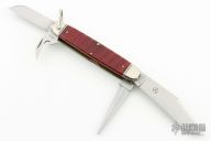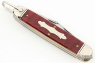This slipjoint from Great Eastern Cutlery features four polished blades with nail nicks. The handle has nickel silver bolsters and cranberry jig bone covers with nickel silver escutcheon, brass liners and steel backsprings. Includes original packaging.  Excellent Condition.