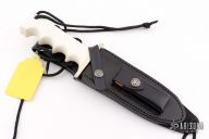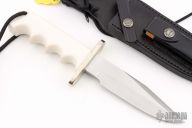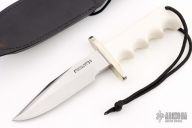 This Model 15 Airman by Randall Made Knives features a clip point blade with .221" stock. 1.271" blade depth. Sharpened top edge, full tang construction. The handle has white linen micarta handle with finger grips and a nickel silver guard. The Model 15 is designed especially for heavy duty use and to be as nearly indestructible as possible. Comes with a black leather sheath and nylon zippered case. Has a couple light scuffs, otherwise excellent condition.