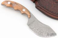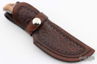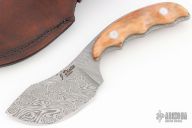 This Skinner from Jeff Diotte features a Damasteel blade with notched thumbrest, .187" blade stock and 1.595" blade depth, full tang construction. The handle has giraffe bone scales. Comes with a hand tooled brown leather sheath and a zippered case. Excellent condition.