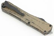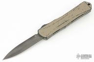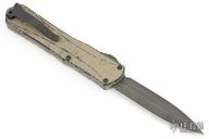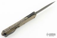 This Manticore-X by Heretic Knives features a DLC dagger blade. The handle has a black aluminum frame with a distressed tan finish and black stainless steel hardware. Tip down clip. S/N #00152. Excellent Condition.
