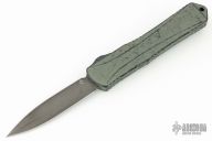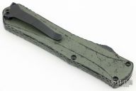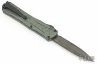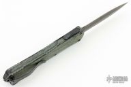 This Manticore-X by Heretic Knives features a DLC dagger blade. The handle has a black aluminum frame with a distressed green finish and black stainless steel hardware. Tip down clip. S/N #00199. Excellent Condition.