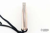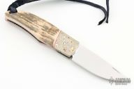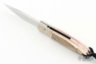 This linerlock by George Roberts features a mirror polished Damasteel blade with nail nick. The handle has dovetailed 3-alloy mokume, mammoth ivory scales with small gold nugget inlays throughout, red liners/spacers, jeweled stainless steel liners, mammoth ivory backspacer with gold nugget inlays. Comes with a zippered case and COA. Excellent condition.