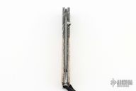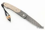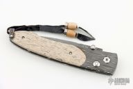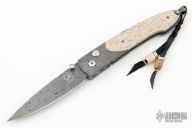 This B10 Saber Tooth button lock folder by William Henry Knives features a Devin Thomas Stainless "Typhoon" Damascus blade with a single thumbstud with a diamond inlay. The handle has a D. Ealy "Cheetah" Damascus frame with fossil bone scales (looks like oosic to me), push button with diamond inlay, lanyard bail with sterling silver bail and beads. Includes box and papers and COA dated June 28, 2007. Excellent condition.