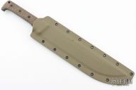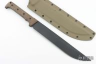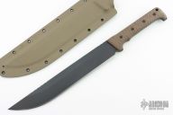 This Short Sword by Miller Bros Blades features a black blade with a fileworked blade spine, .324" blade stock 1.98" blade depth, full tang construction. The handle has brown G-10 scales, lanyard holes.  Comes with a kydex sheath. Excellent condition.