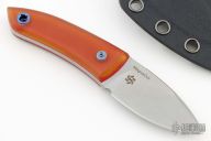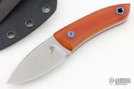 This Forager by Mechforce is a Ben Krein design. It features a stonewash finished drop point blade with a notched thumbrest and full tang construction, .158" blade stock, .975" blade depth. The handle has Ultem scales with orange liners and anodized titanium hardware. Lanyard hole in pommel. Includes a kydex sheath and original box.  New from maker!