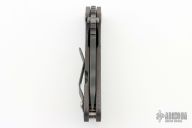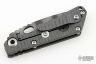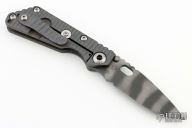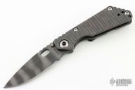 This JVA by Mick Strider is larger than a PT, but smaller than an SNG. It features a tiger striped blade with notched thumbrest and thumbhole. The handle has a flame finished titanium frame with matching tip up clip. New from Maker.