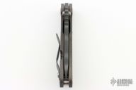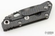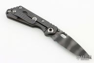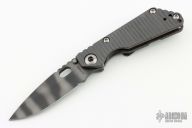 This JVA by Mick Strider is larger than a PT, but smaller than an SNG. It features a tiger striped blade with notched thumbrest and thumbhole. The handle has a flame finished titanium frame with matching tip up clip. New from Maker.
