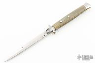This 13" Picklock by "Made in Italy" features a stonewashed blade. The handle has stainless steel bolsters, front and rear, honey horn scales, brass liners, stainless spring. Excellent condition.