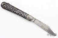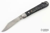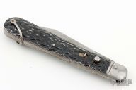 This antique auto by Presto features a mirror polished clip point blade. The handle has jigged steel scales, steel liners and backspacer, has safety. Nice action and blade seating. Has some blade play, scratches and oxidation, otherwise good condition.
